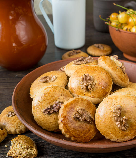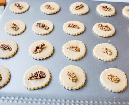 Кладем на противень, смазываем яйцом, на каждую печеньку кладем четвертинку ореха.