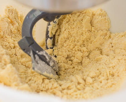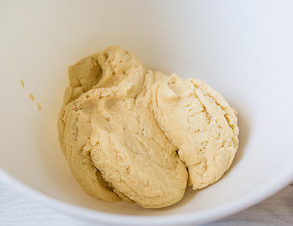 Добавляем желток и уксус. Постепенно вливая воду, замешиваем эластичное тесто. Слишком долго не месим, чтобы печенье не получилось дубовым.
