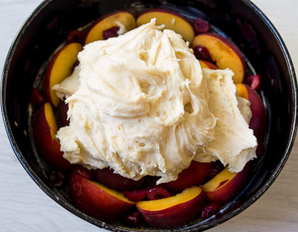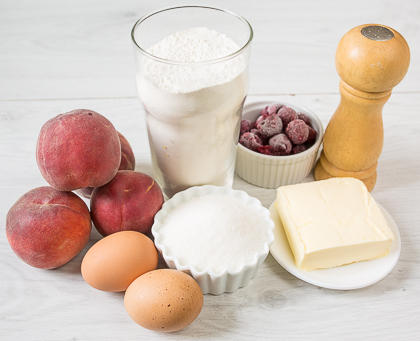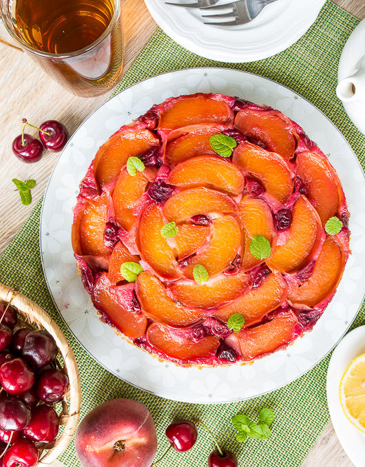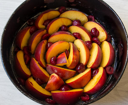 Форму смазываем сливочным маслом и присыпаем сахаром (только дно). Кладем кусочки персиков, между ними - вишни.
